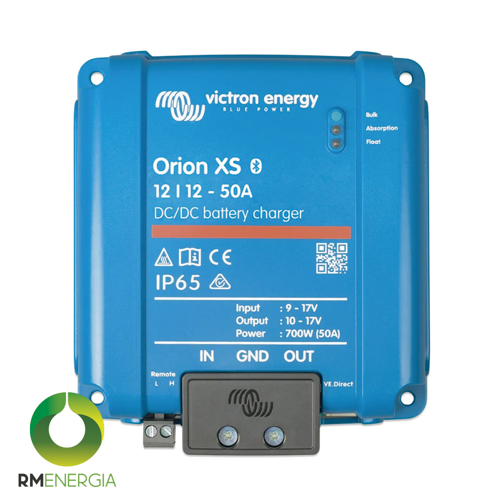 Cargador DC-DC Victron Orion XS 12/12-50A con Bluetooth, alta eficiencia y protección IP65. Ideal para sistemas duales en vehículos, energía solar y aplicaciones off-grid.