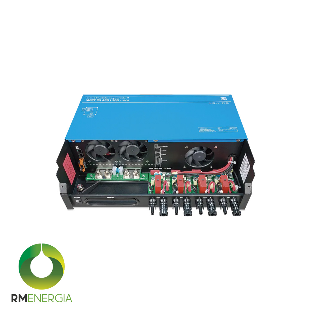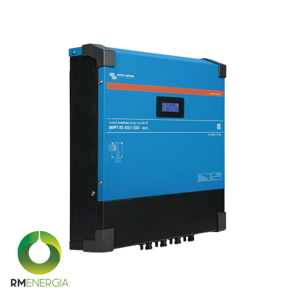 Controlador solar Victron SmartSolar MPPT RS 450/200-MC4 para sistemas de 48V. Soporta hasta 450V en paneles FV, 200A de carga y 11,5 kW de potencia máxima. Cuatro MPPT independientes, Bluetooth, pantalla integrada y comunicación VE.Can. Ideal para sistemas solares industriales y de gran capacidad.